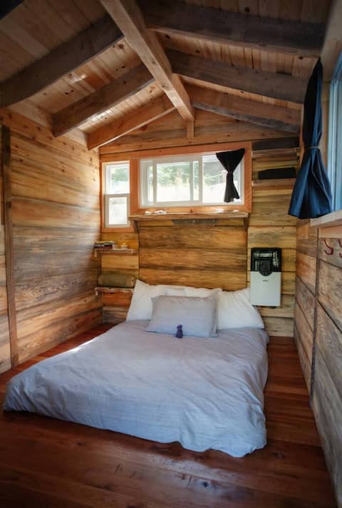 Sous son toit de style japonais, on trouve un vrai lit avec literie et duvet, quelques tablettes, une modeste table pliante et un chauffage au propane pour les nuits plus fraîches.